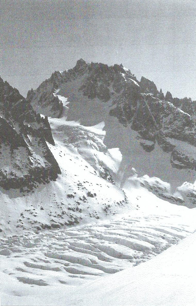 Il nous faut remonter une moraine puissante suivie de combes ascendantes dominées par l’arête d’une modeste aiguille, première d’une série de sommets extraordinaires, grandioses autant que célèbres. Le principal d’entre eux, qui domine tous les autres, est la magnifique aiguille légendaire, probablement la plus belle du massif tout entier, qui dépasse les quatre mille et présente de ce côté une face septentrionale parfaitement glaciaire qui coupe le souffle au propre comme au figuré. On aborde enfin la glace par les rives aimables des derniers névés à l’aplomb du seul glacier affluent de cette rive.