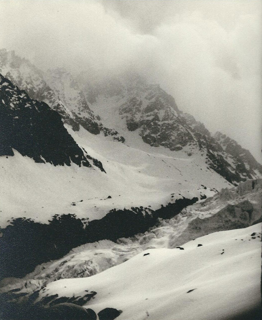 C’est précisément de milieu dont il s’agit. Nous devons traverser le glacier d’une rive à l’autre, d’une part parce que plus loin commence une zone de crevasses en forme d’arcs parallèles dont la largeur et le grand nombre rendent l’endroit fort périlleux, d’autre part parce que le refuge se trouve sur la moraine opposée. C’est un parcours en diagonale qui nous éloigne des grandes faces et nous rapproche des montagnes moins magnifiquement rébarbatives. J’en suis d’autant plus rassuré que je m’aperçois, en me retournant de temps à autres, que le spectacle des parois est d’autant plus beau que nous l’observons à distance croissante. Le recul amplifie la grandeur et l’immédiat dissimule l’admirable.