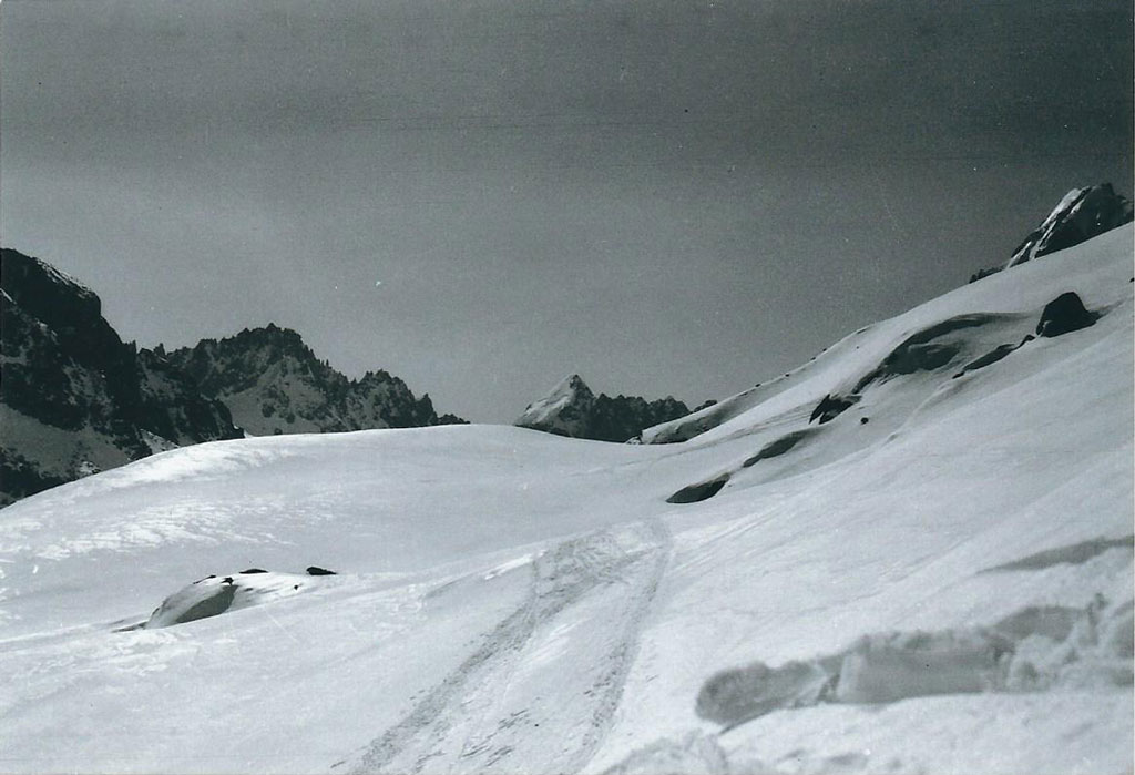 On ne devrait jamais admirer par derrière ce qu’on n’a pas examiné d’abord par devant. Notre col n’est que le rebord d’un vaste plateau aussi horizontal qu’une place du marché. D’un côté, cette esplanade monte mollement jusqu’aux pentes qui se perdent dans une face glaciaire mixte horriblement compliquée, de l’autre, elle s’arrondit en laissant deviner l’amorce d’une probable dépression dont nous ne voyons rien du tout. L’ensemble du paysage est assurément magnifique, d’autant plus que toute la longue vallée est visible en enfilade jusqu’à des distances inimaginables. Pour des skieurs disposés à s’intéresser aux descentes prestigieuses plus qu’aux balcons suspendus, elle manque sérieusement de séduction.