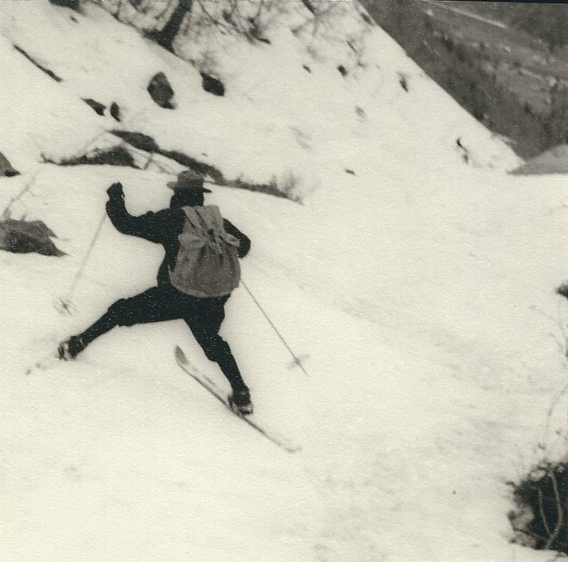 Comme de juste, il attaque en premier la descente des névés qui garnissent cette heureuse vallée bien ensoleillée, entre les rapides du glacier fracassé et les pentes raides d’une crête en dents de scie qui se perd, tout en bas, dans de vastes pentes ondulées. Le refuge est à droite, assez loin pour nous inciter à batifoler en virages serrés dans la neige ramollie du printemps douceâtre qui monte des forêts profondes où chante le coucou.